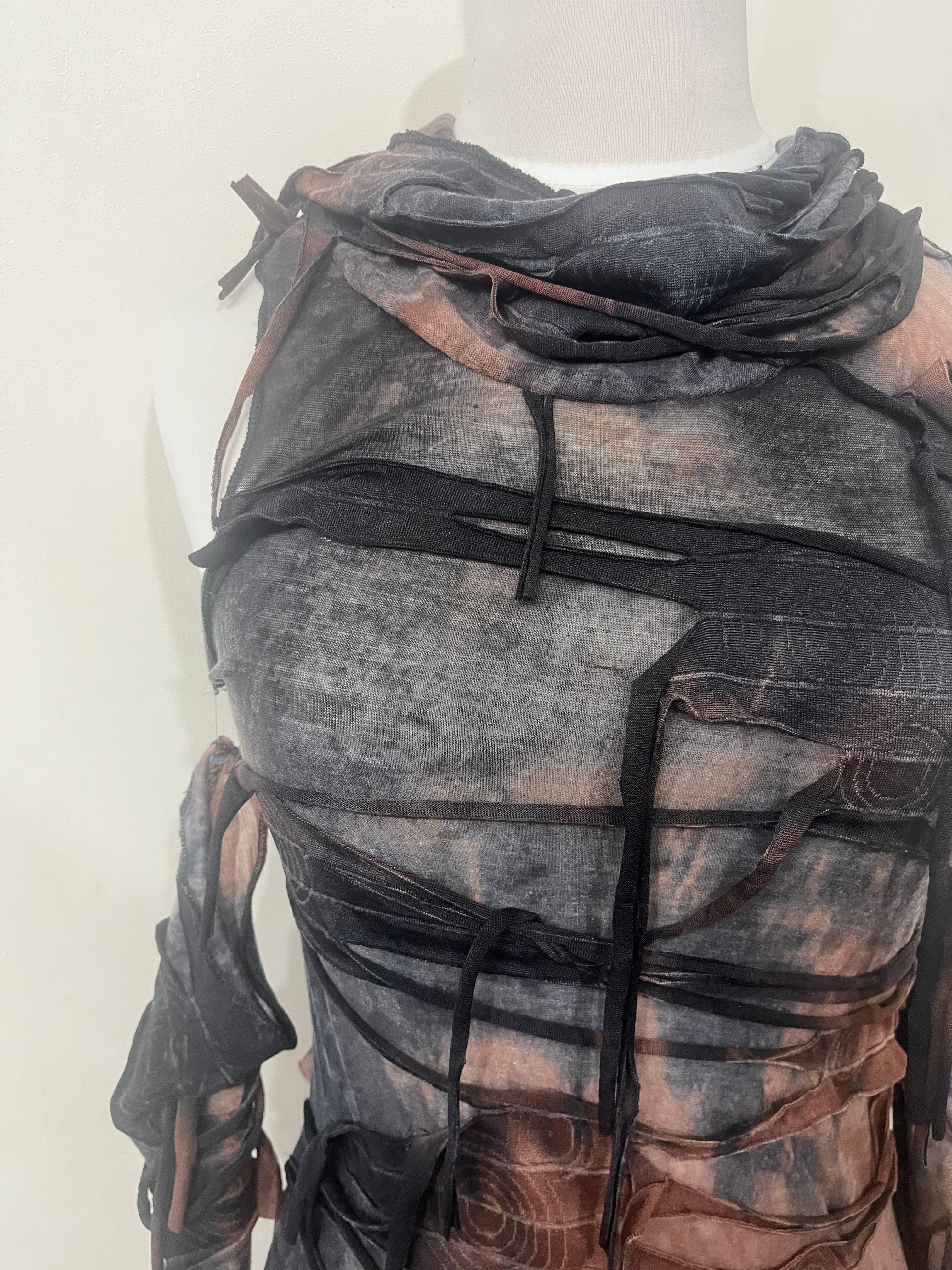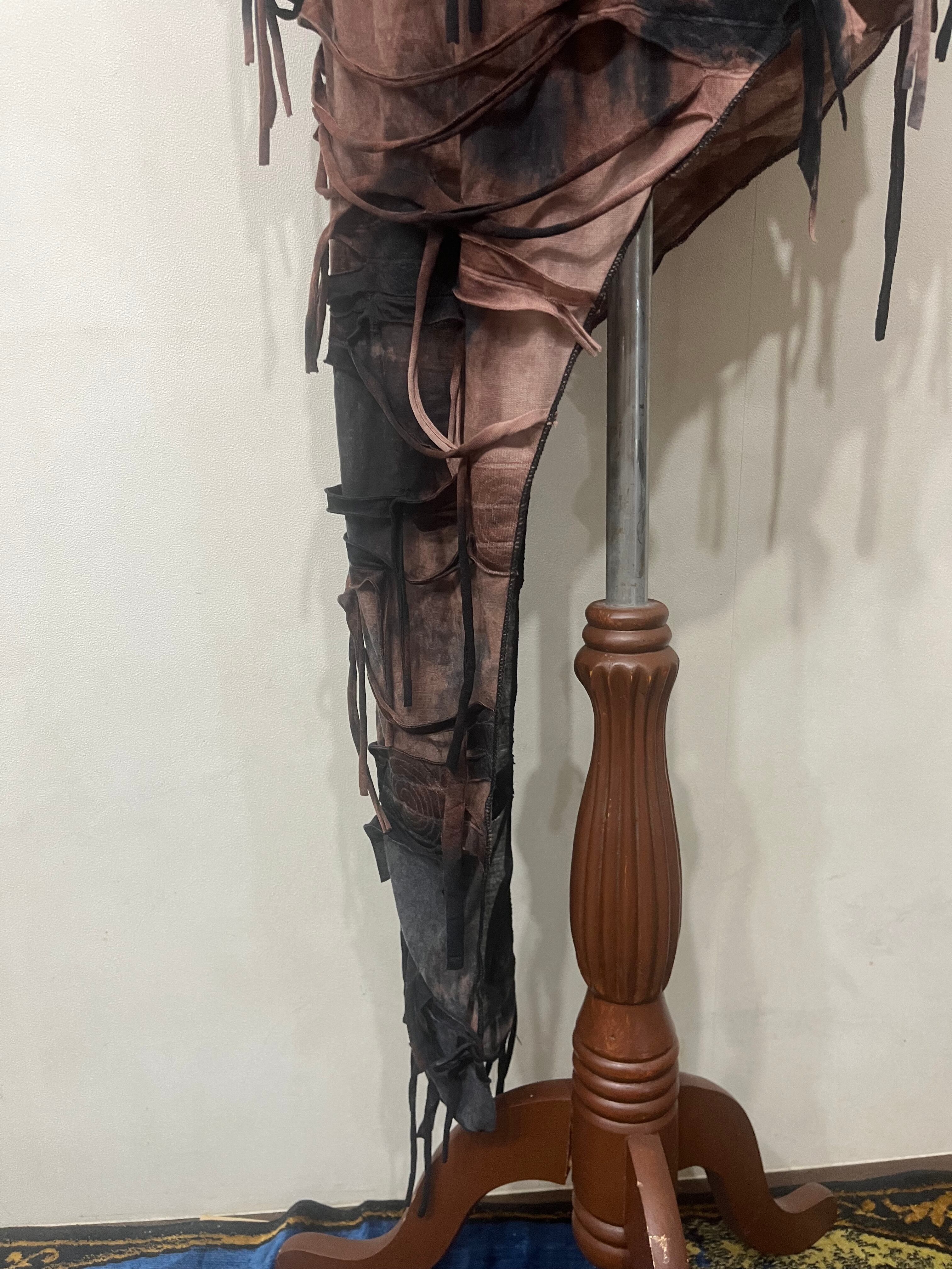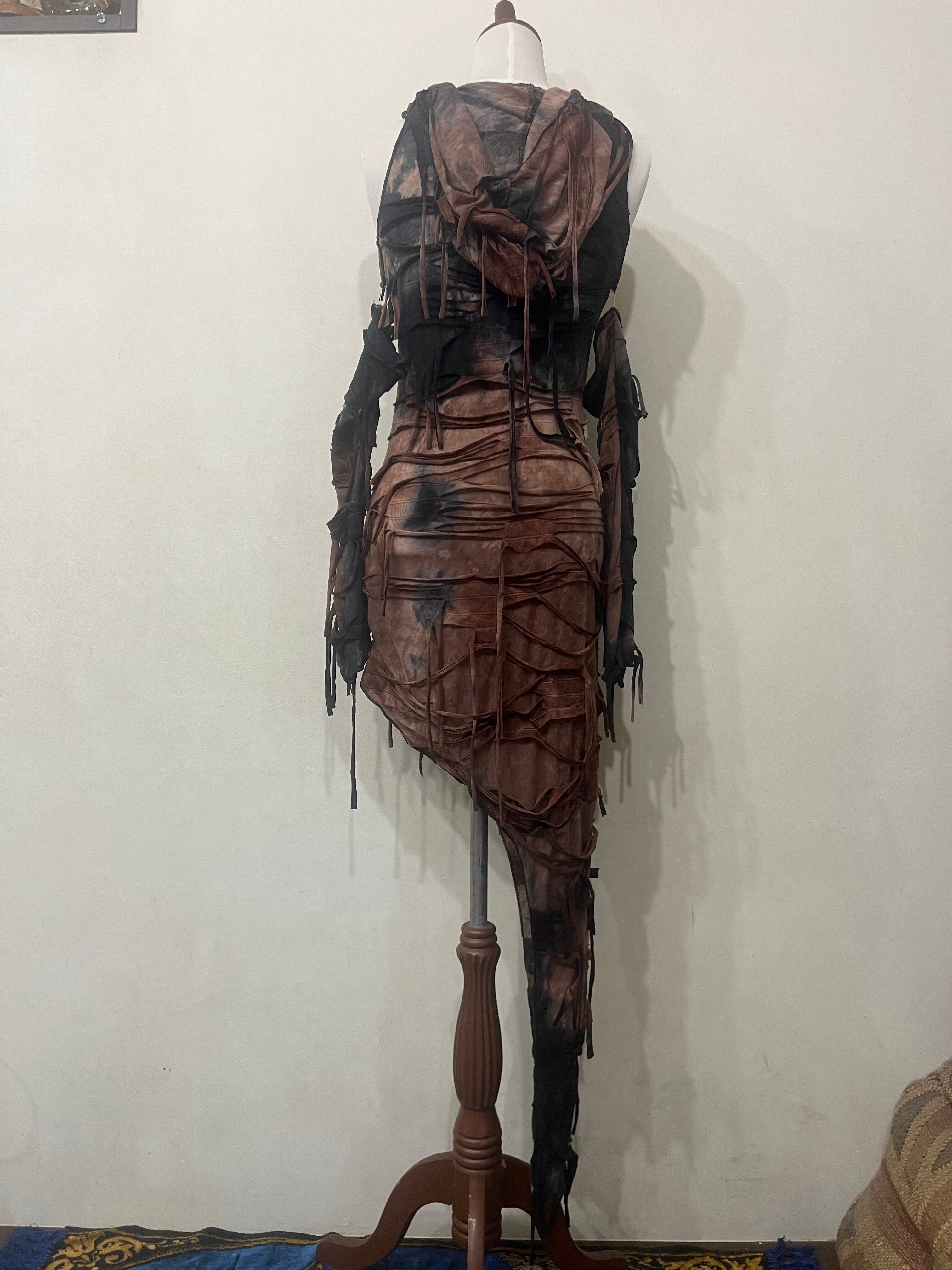 ■ 新品 タイダイダメージ風フリンジ タイトワンピース アシメ アームカバー付き