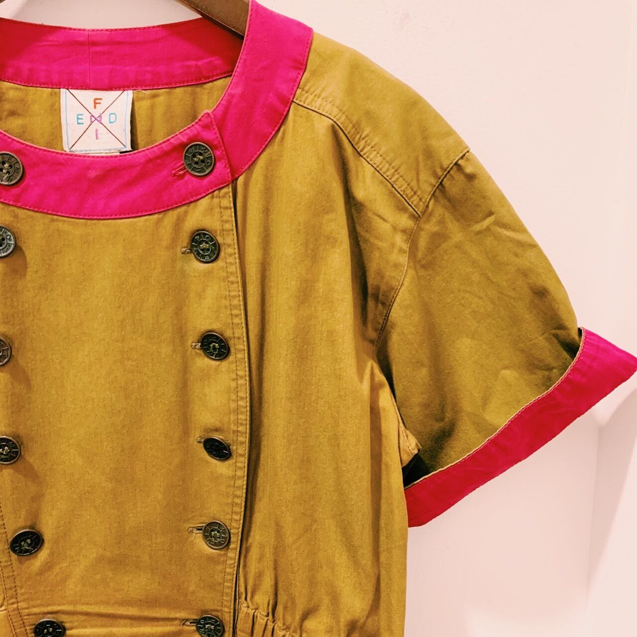 カーキ色とビビットピンクの色合いが素敵なワンピ。