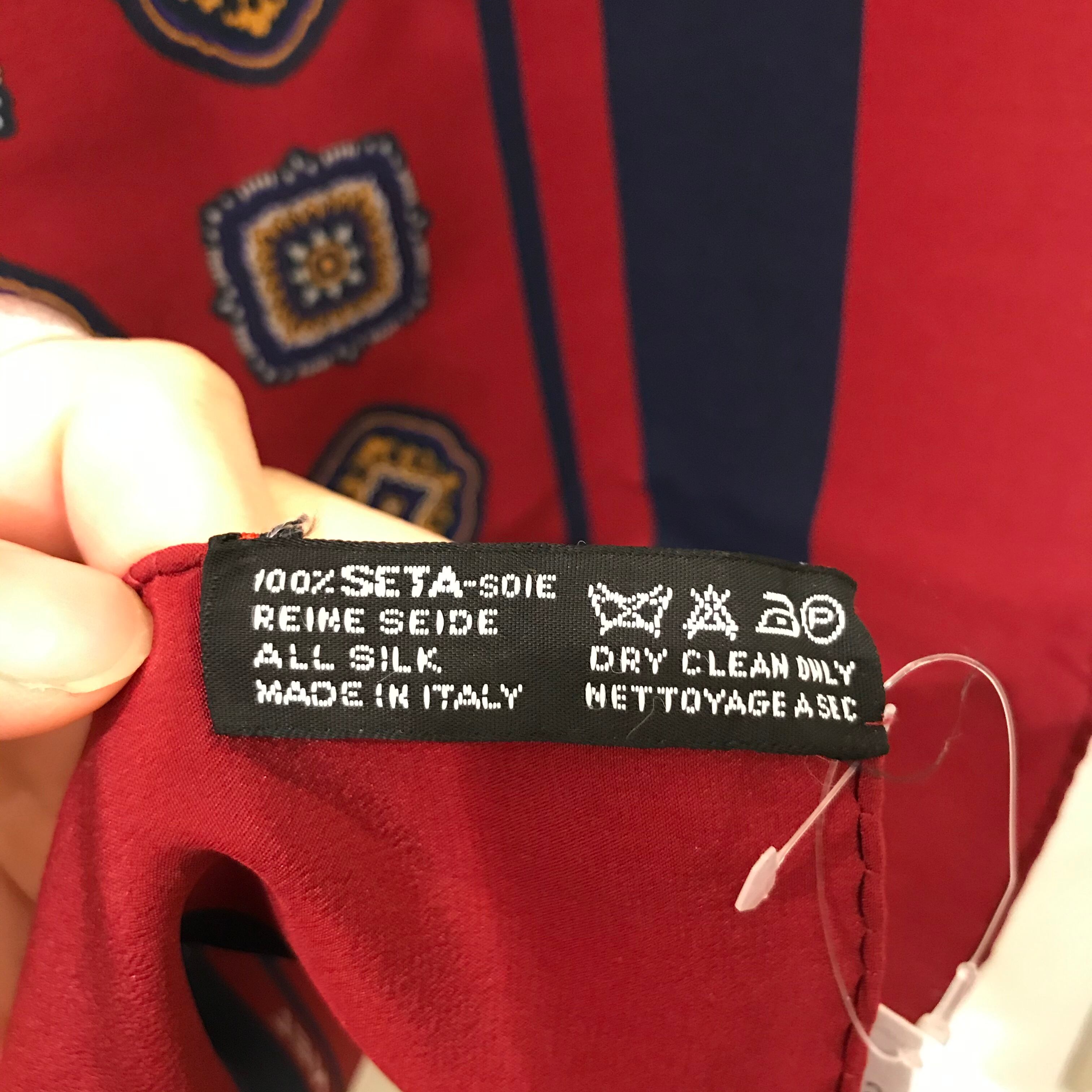 深みのあるレッド、ネイビーカラーとアンティークテイストの柄がお洒落なCHANELのスカーフです。