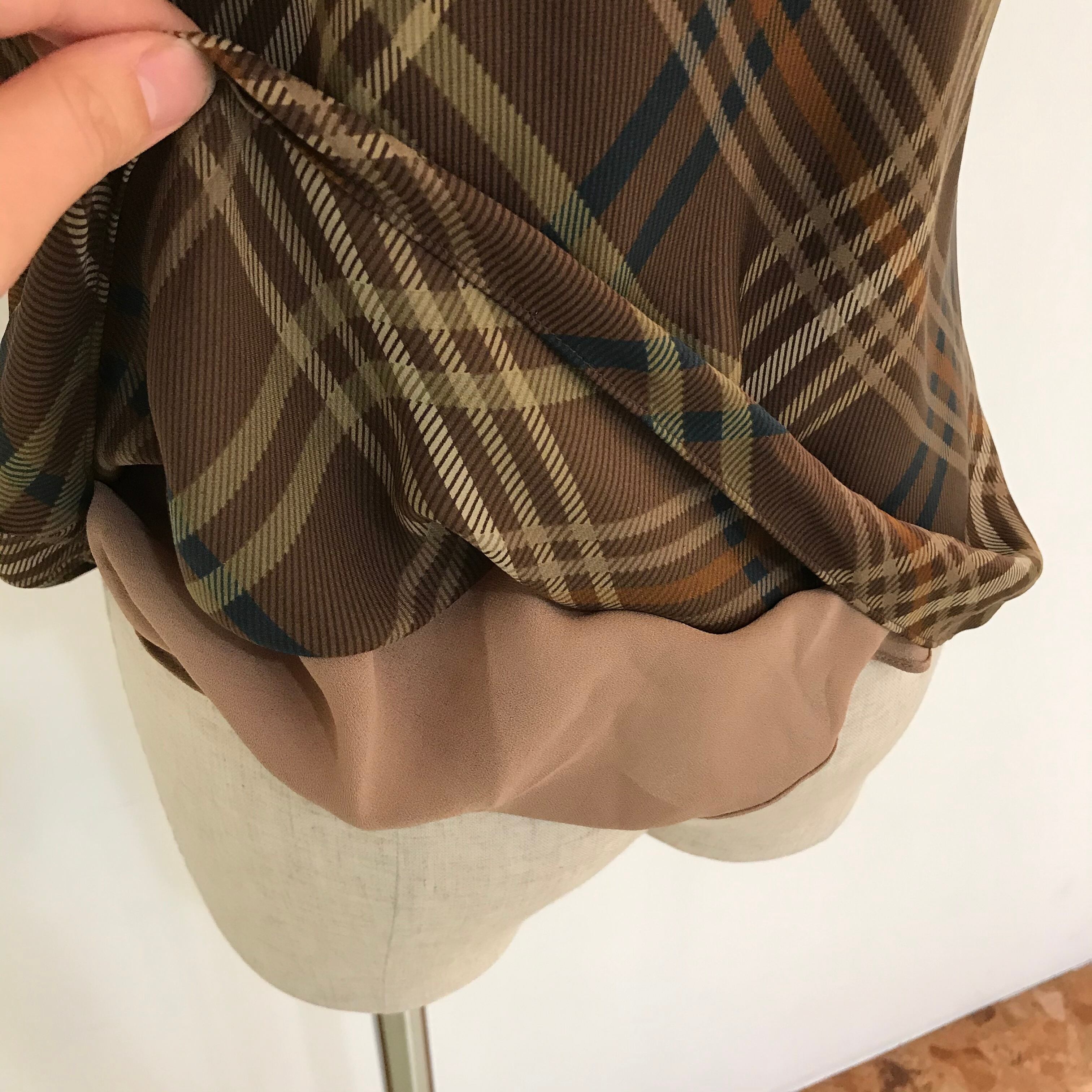 ブラウンカラーとチェック柄、くしゅっとしたハイネックデザインが大人な印象◎