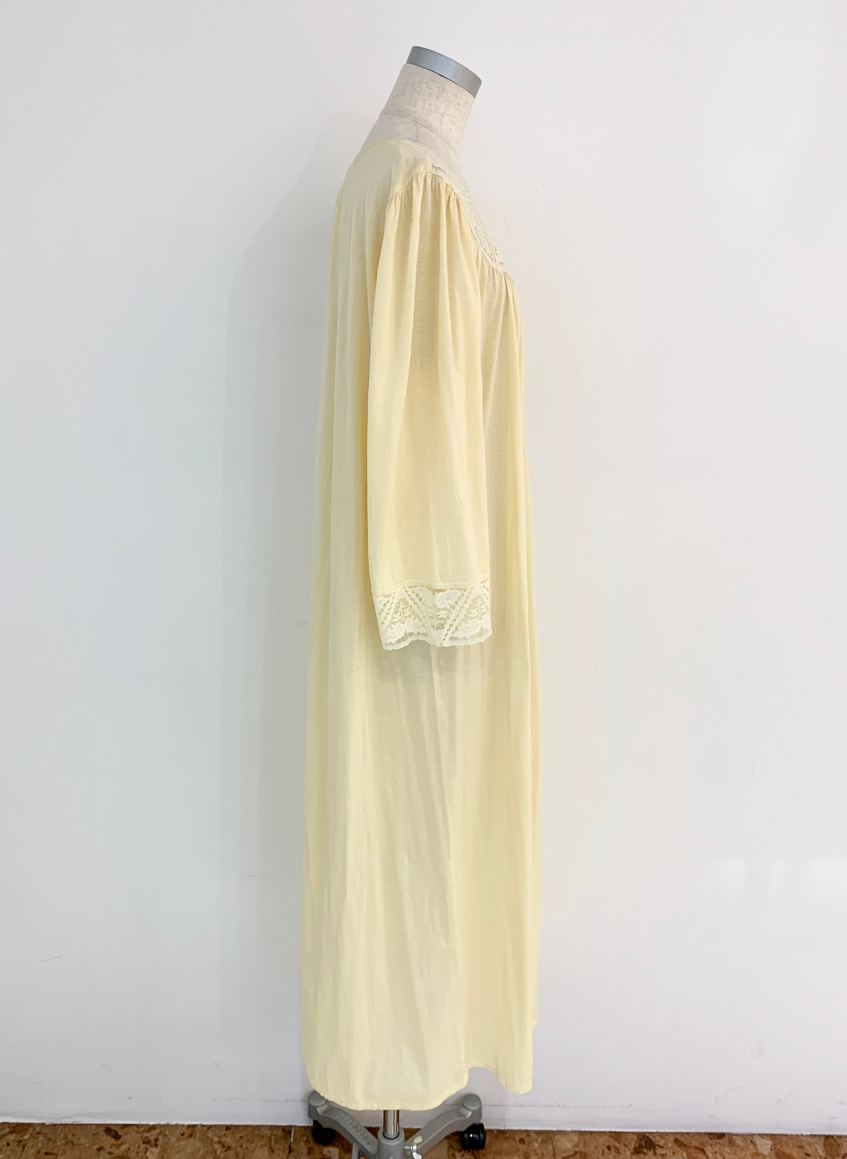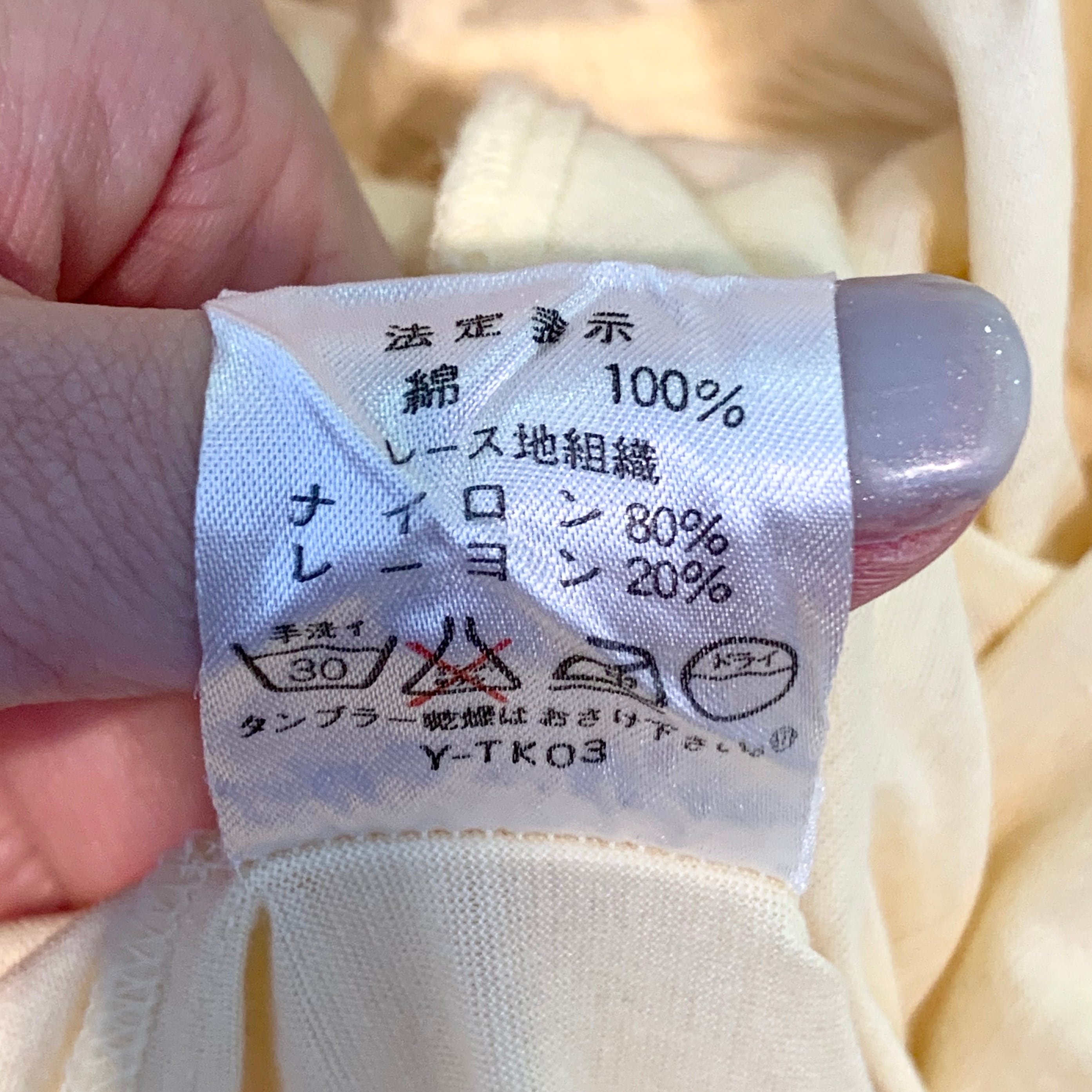 お色は淡い黄色で袖口と胸元にレースがあり、全体的に若干の透け感がございます