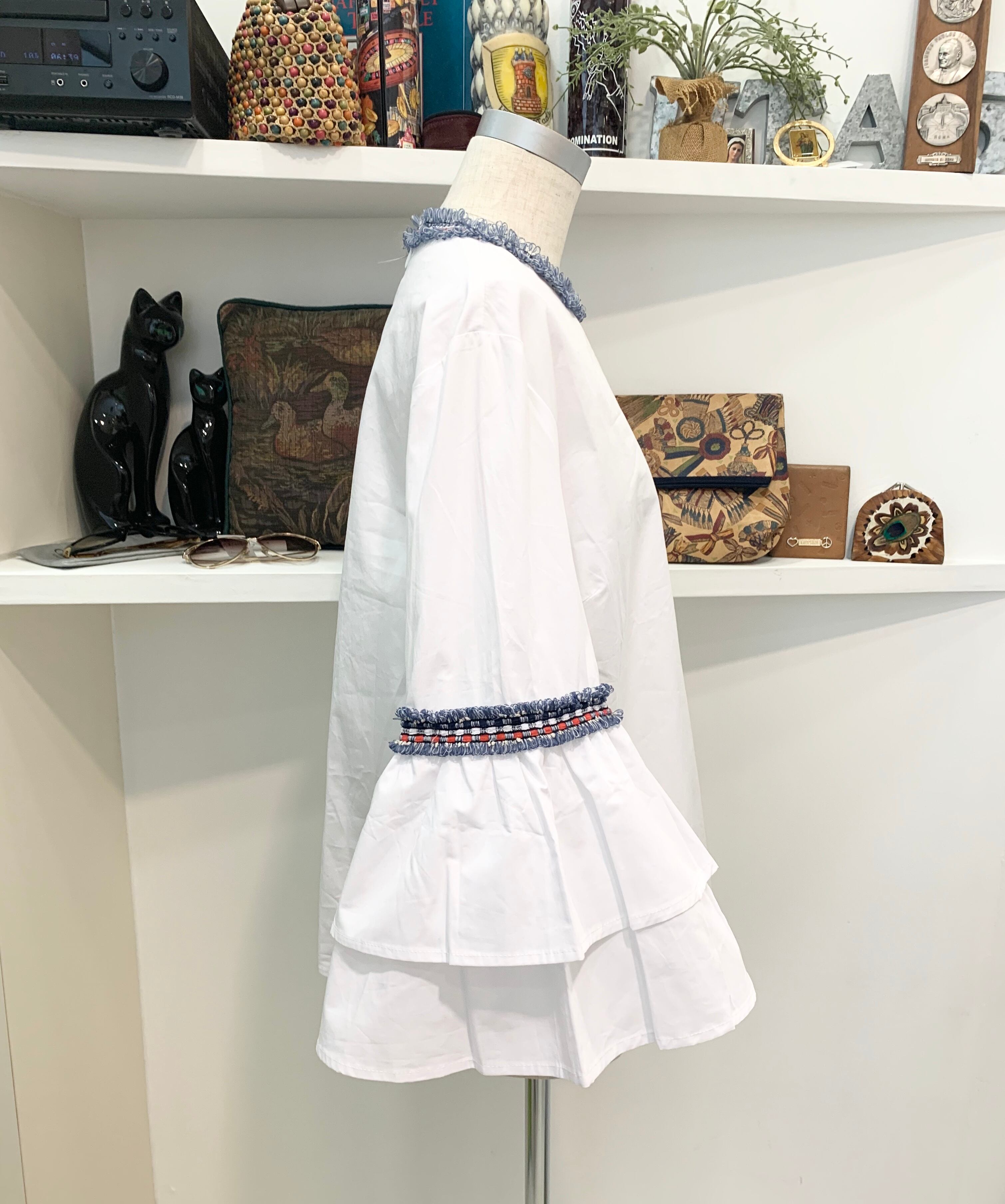 お色は白色で首と袖にフリンジがあり、大きなフリル袖がお洒落な1枚です