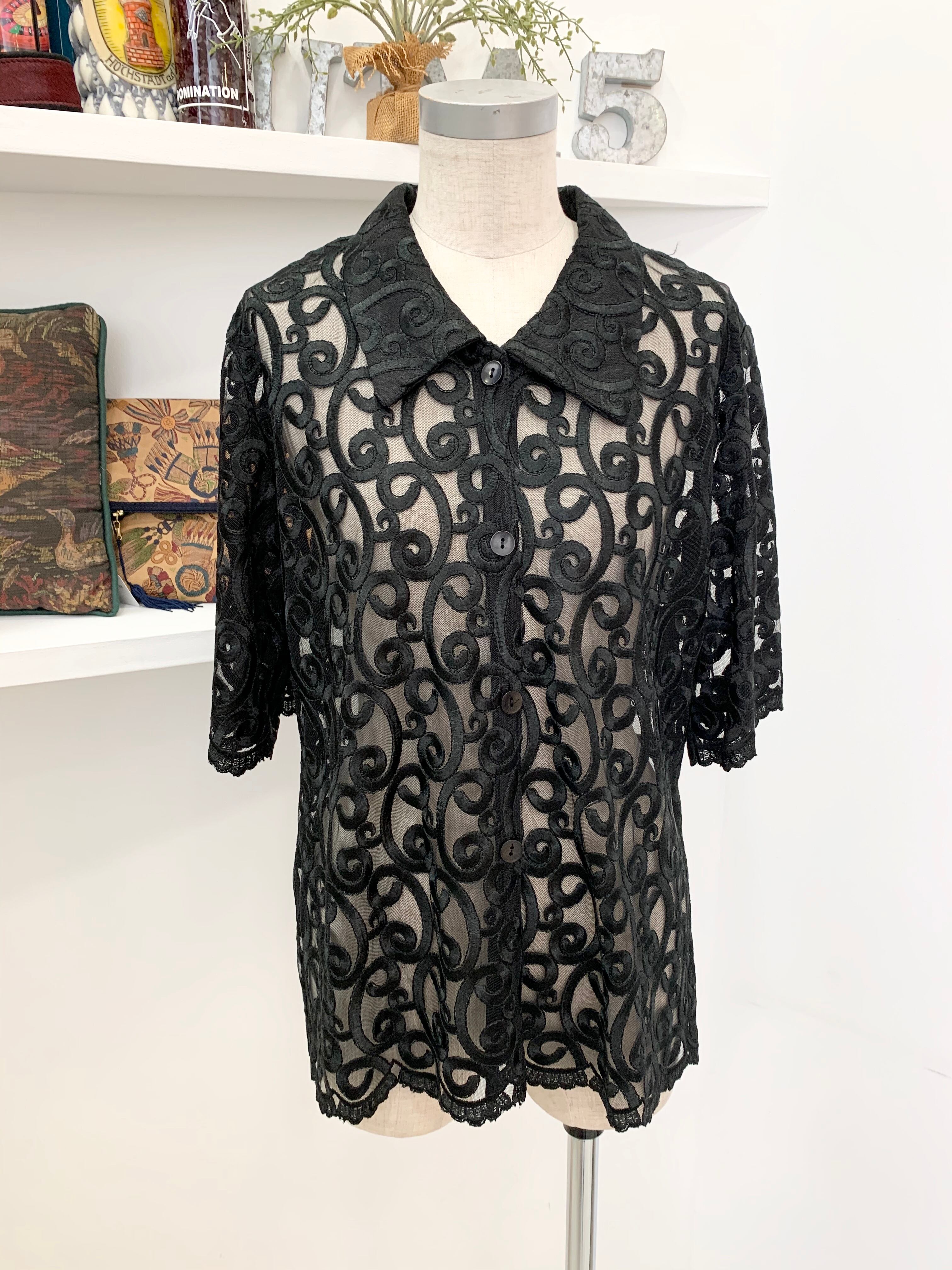 vintage/ヴィンテージ/半袖シャツ/shirt/総レース/うずまき模様/サイズM/黒色