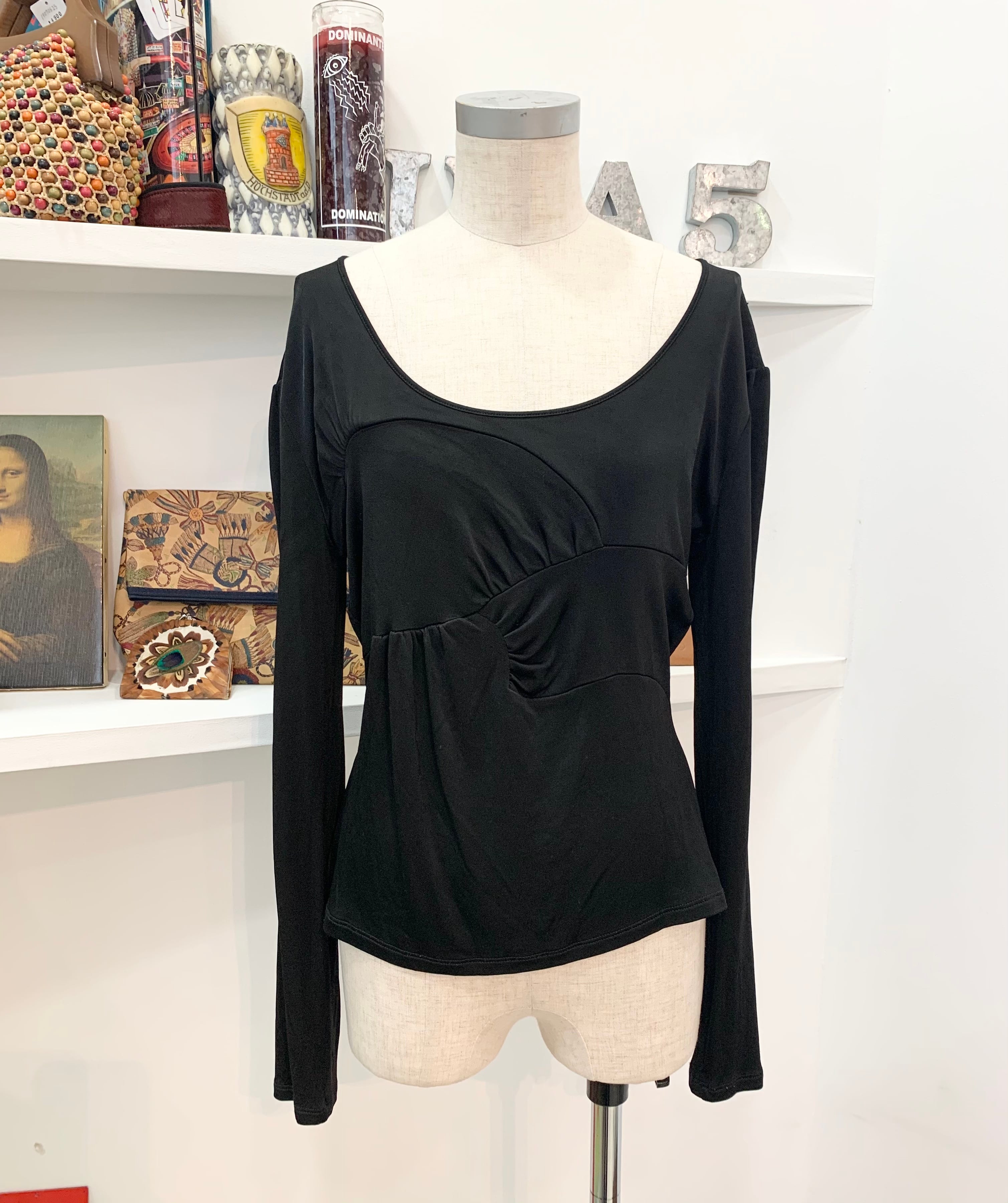 お色は黒色で深めのスクエアネックがとても女性らしいデザインになります
