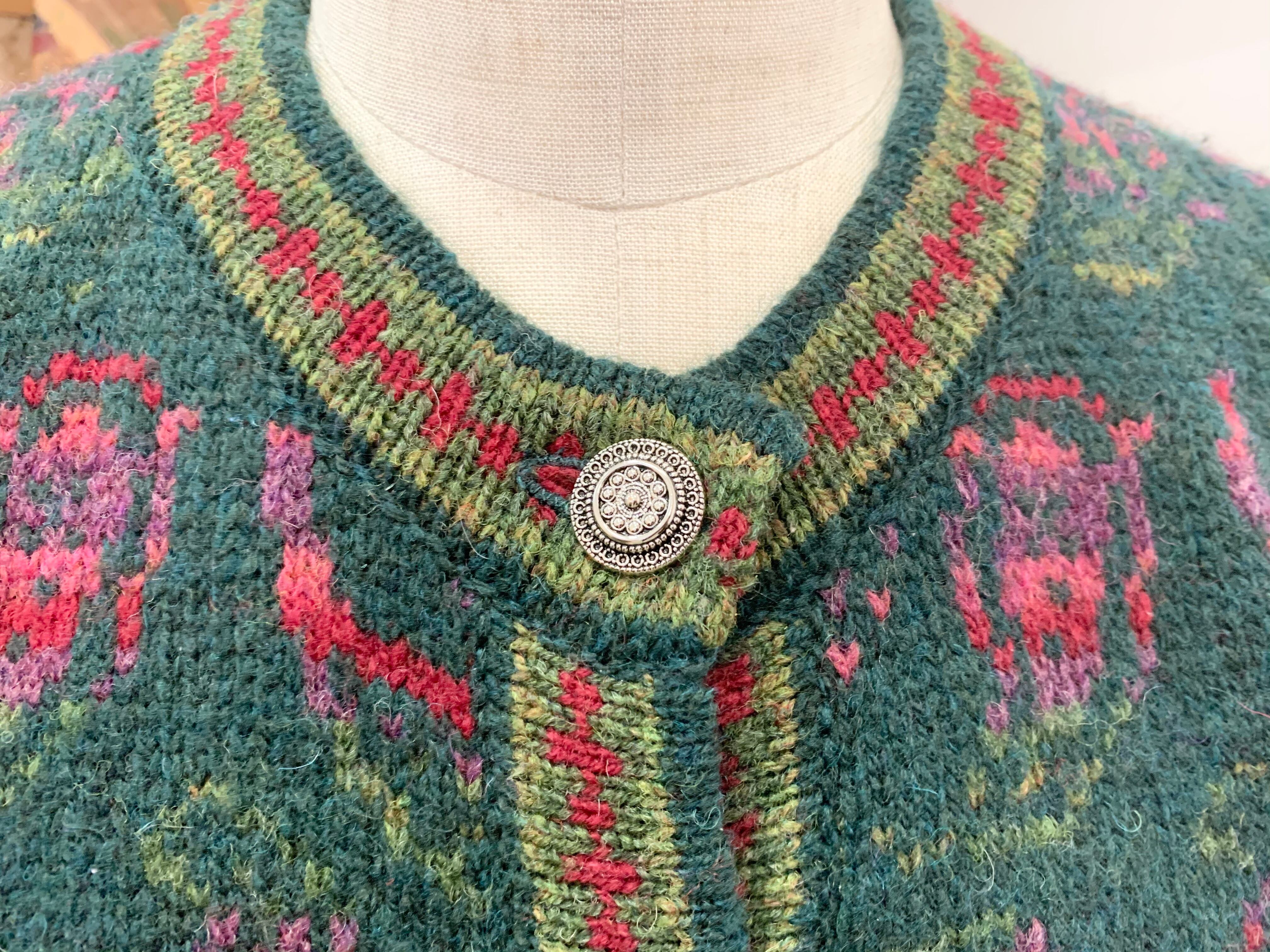 スコットランド製/ニット/カーディガン/knit/cardigan/緑色/サイズS/ボタニカル柄/シルバーボタン/ウール/vintage/ヴィンテージ