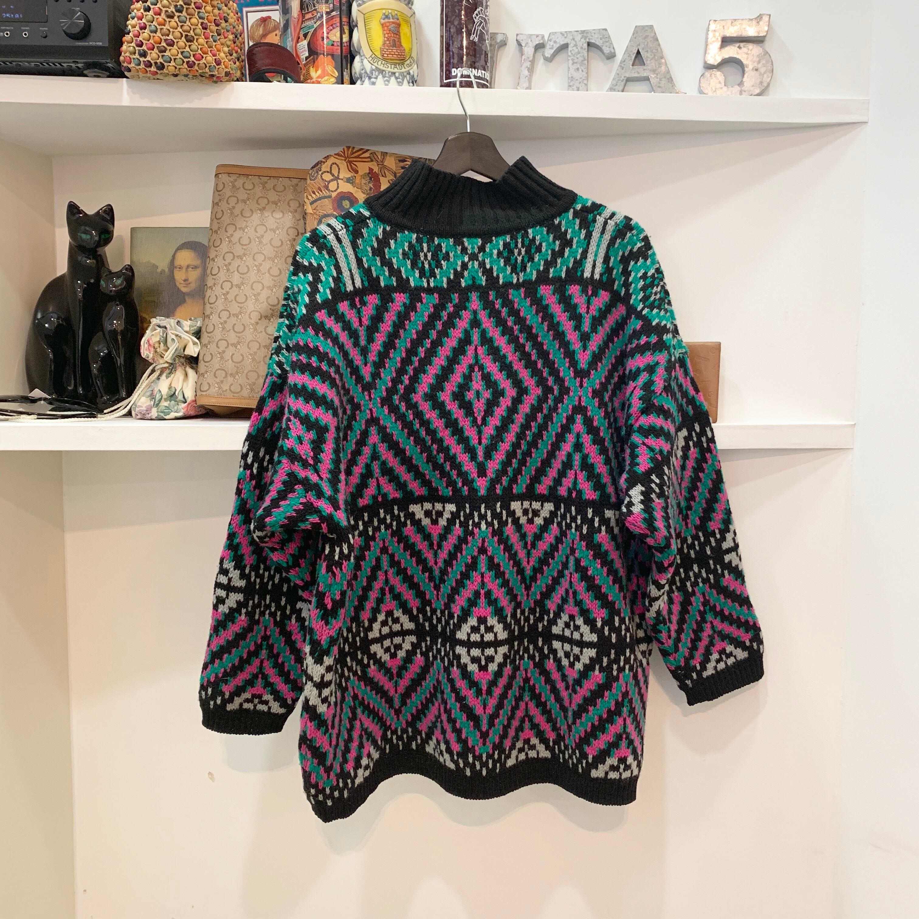 benetton/knit/black/ベネトン/ニット/イタリア製/幾何学模様/黒/ピンク/緑