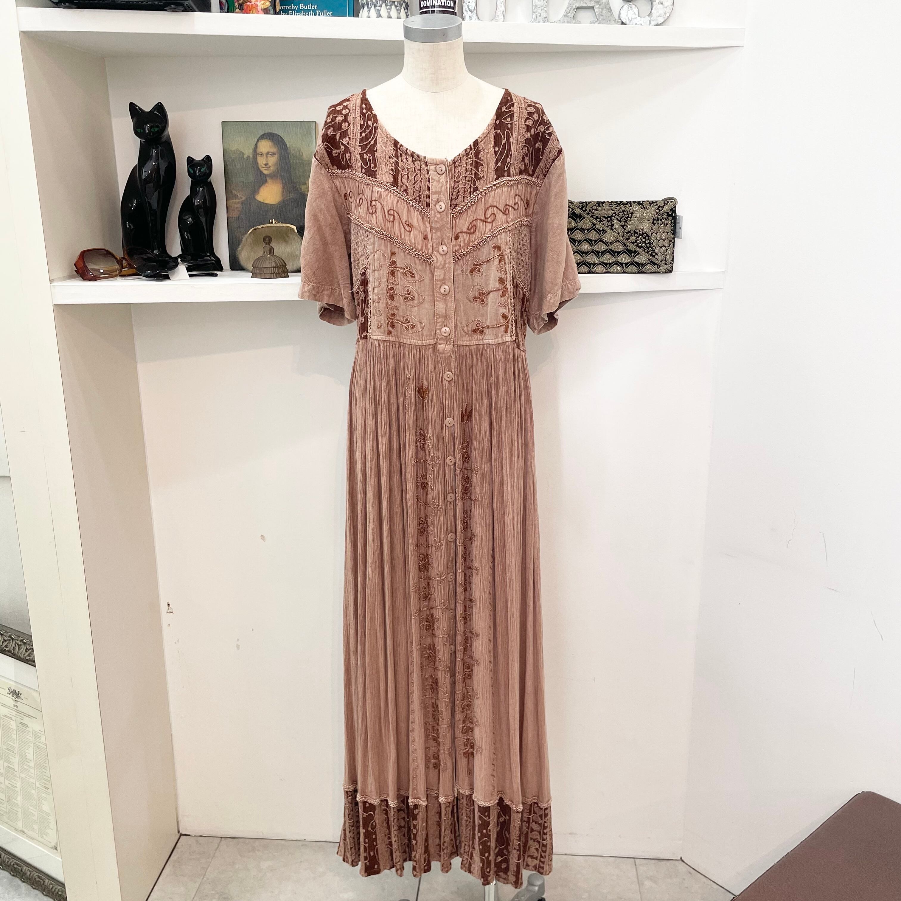 vintage/one-piece/ethnic/brown/beige/ビンテージ/ヴィンテージ/ワンピース/ロングワンピース/半袖/エスニック柄/刺繍/茶色/ベージュ