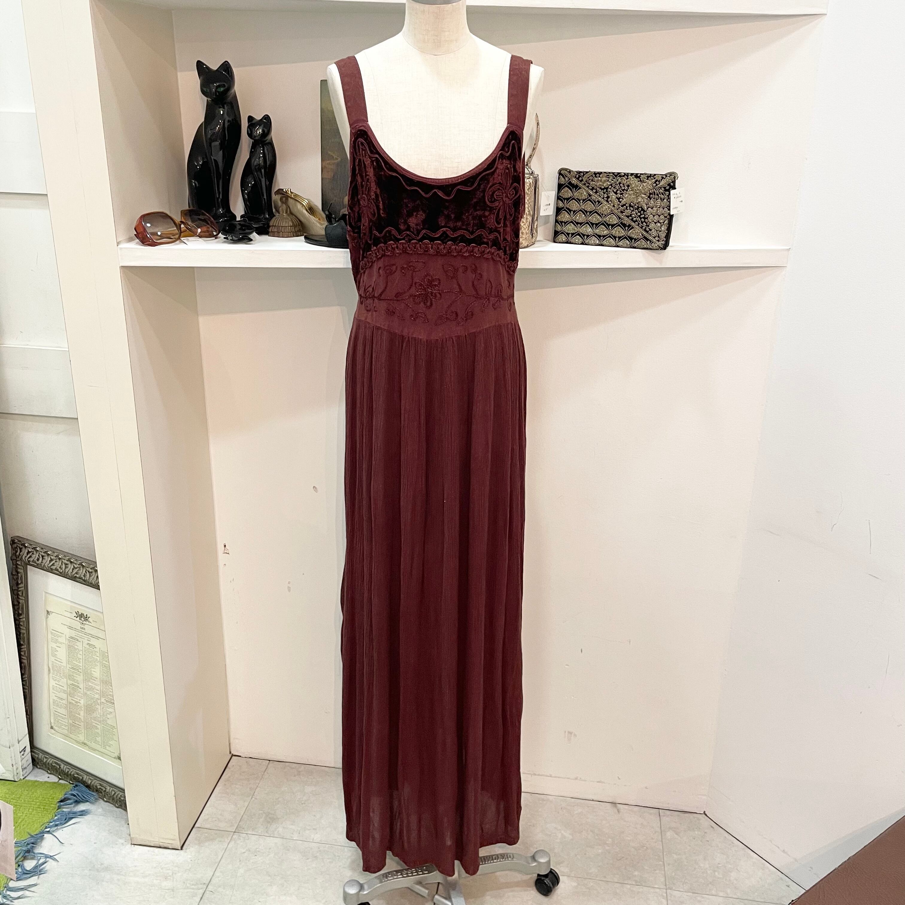 vintage/one-piece/velours/red/ビンテージ/ヴィンテージ/ワンピース/ノースリーブ/赤/バーガンディー/刺繍/ベロア