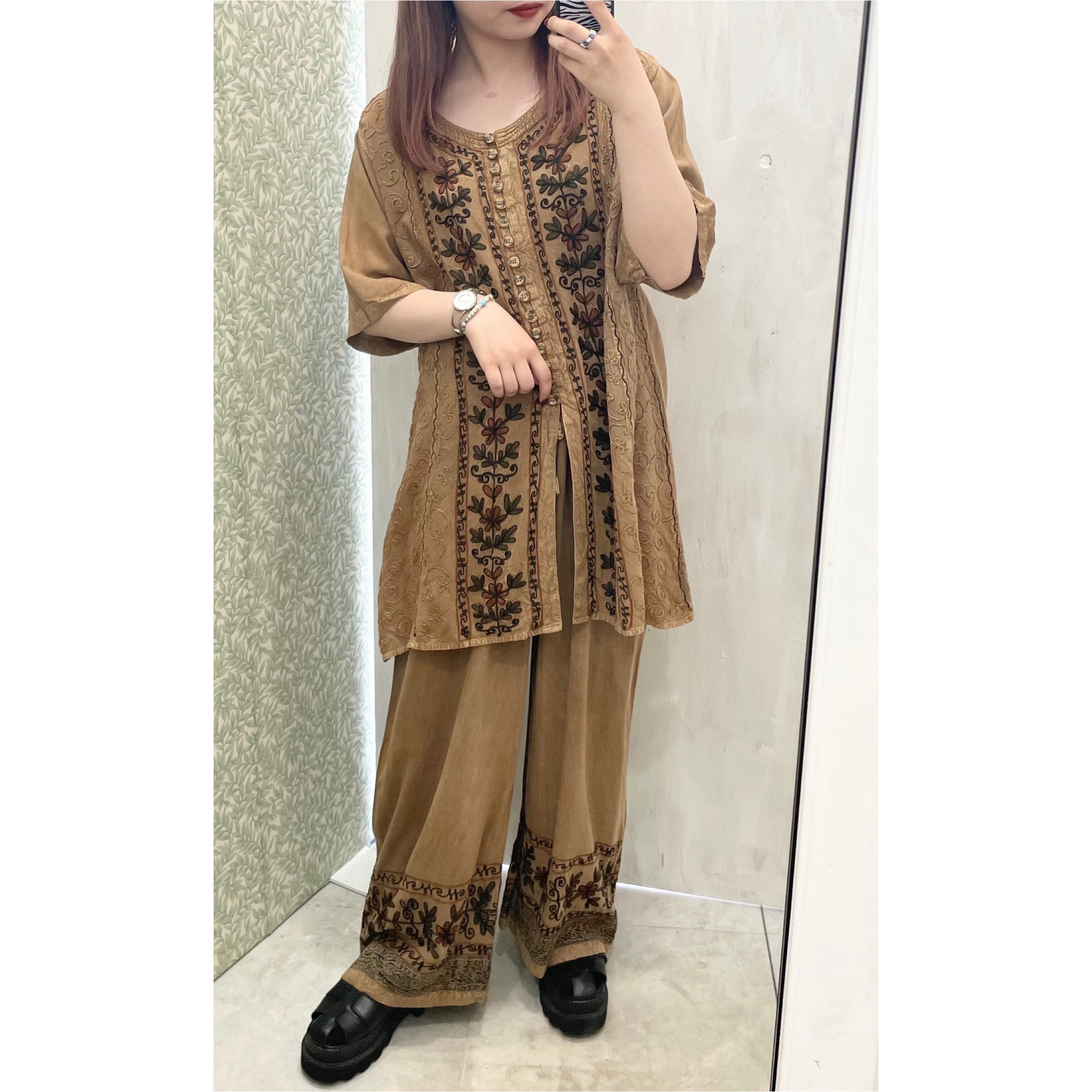 vintage/setup/flower/pants/tops/brown/freesize/ビンテージ/ヴィンテージ/セットアップ/花/刺繍/茶色/パンツ/フリーサイズ