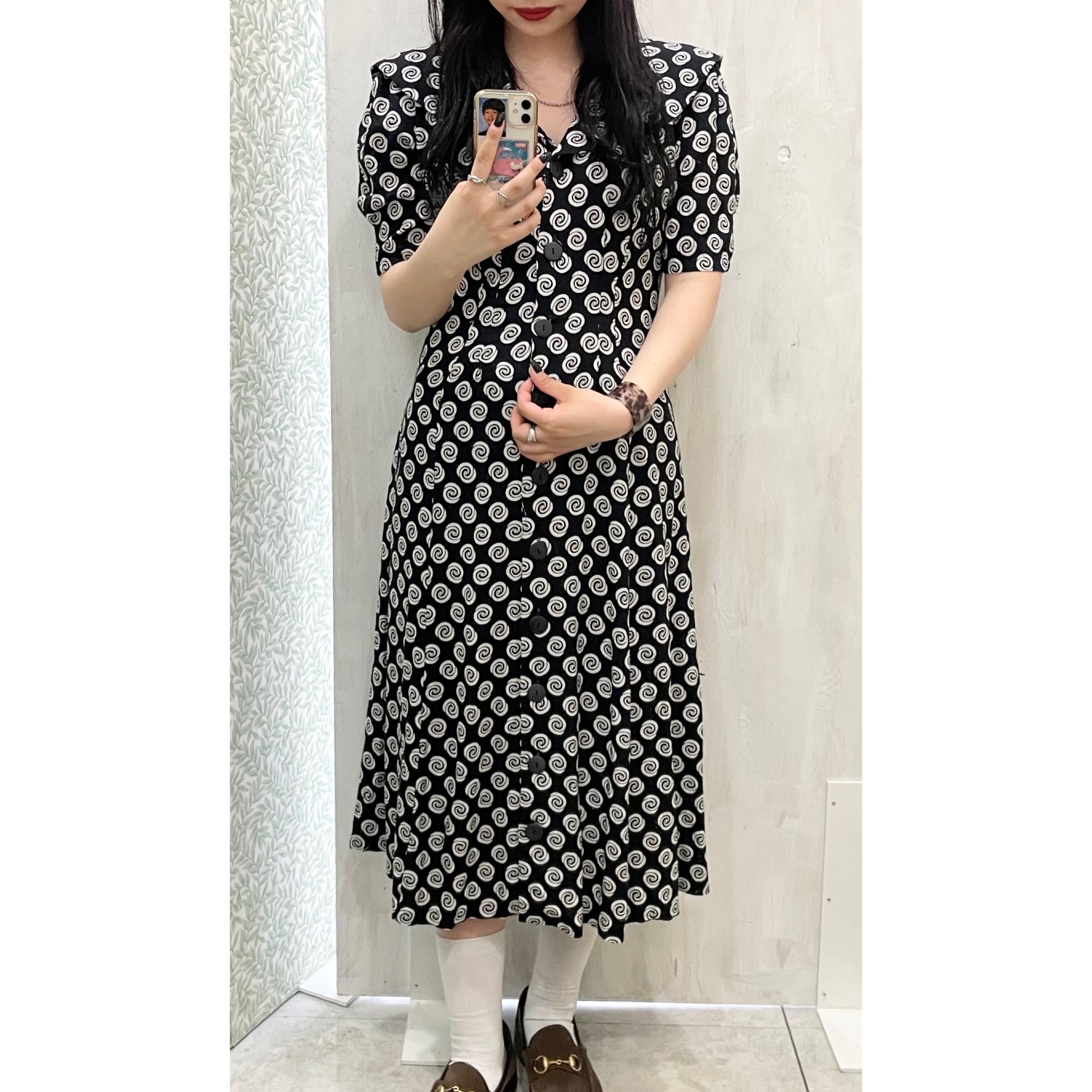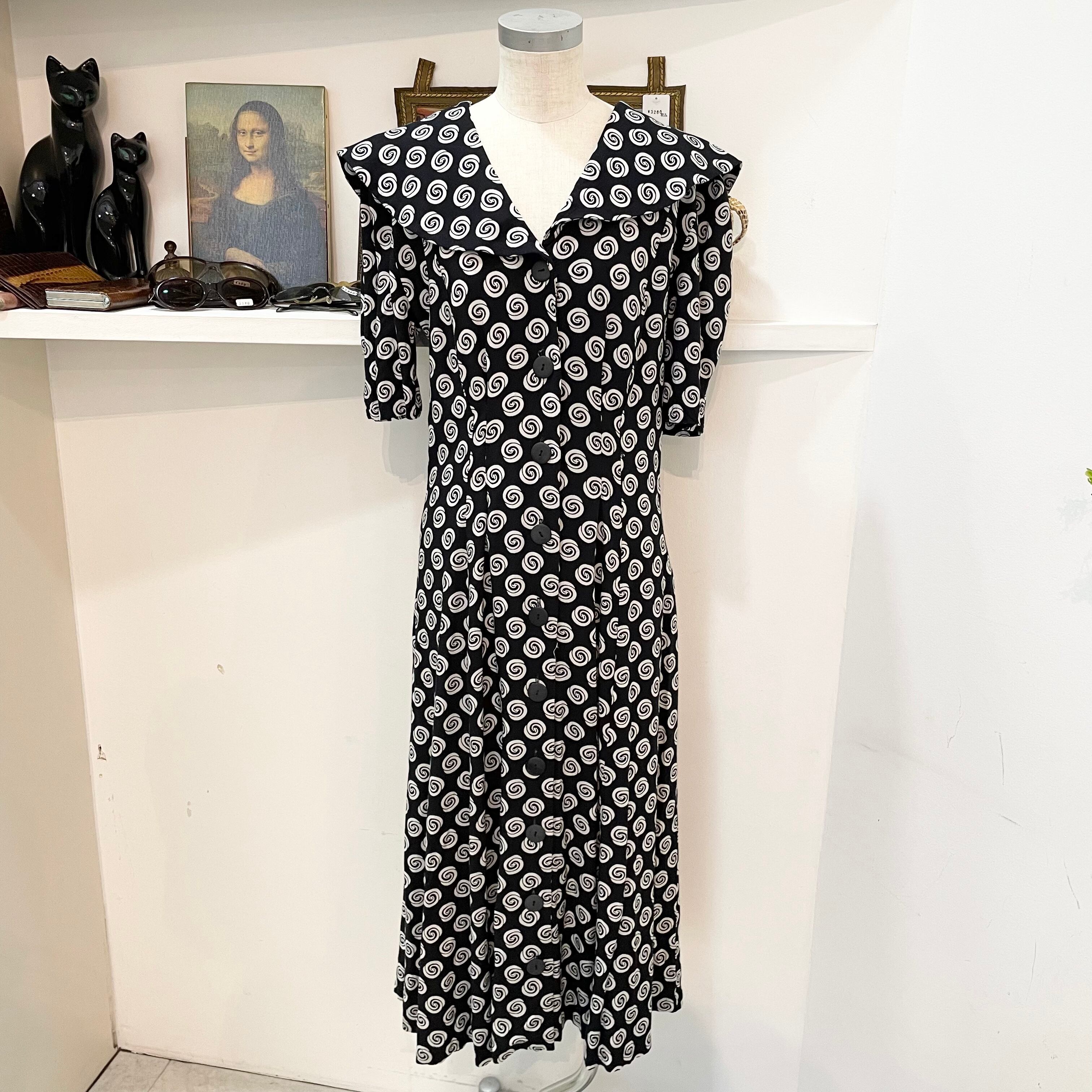vintage/one-piece/long/black/white/ビンテージ/ヴィンテージ/ワンピース/長め/半袖/襟付き/渦巻/黒/白
