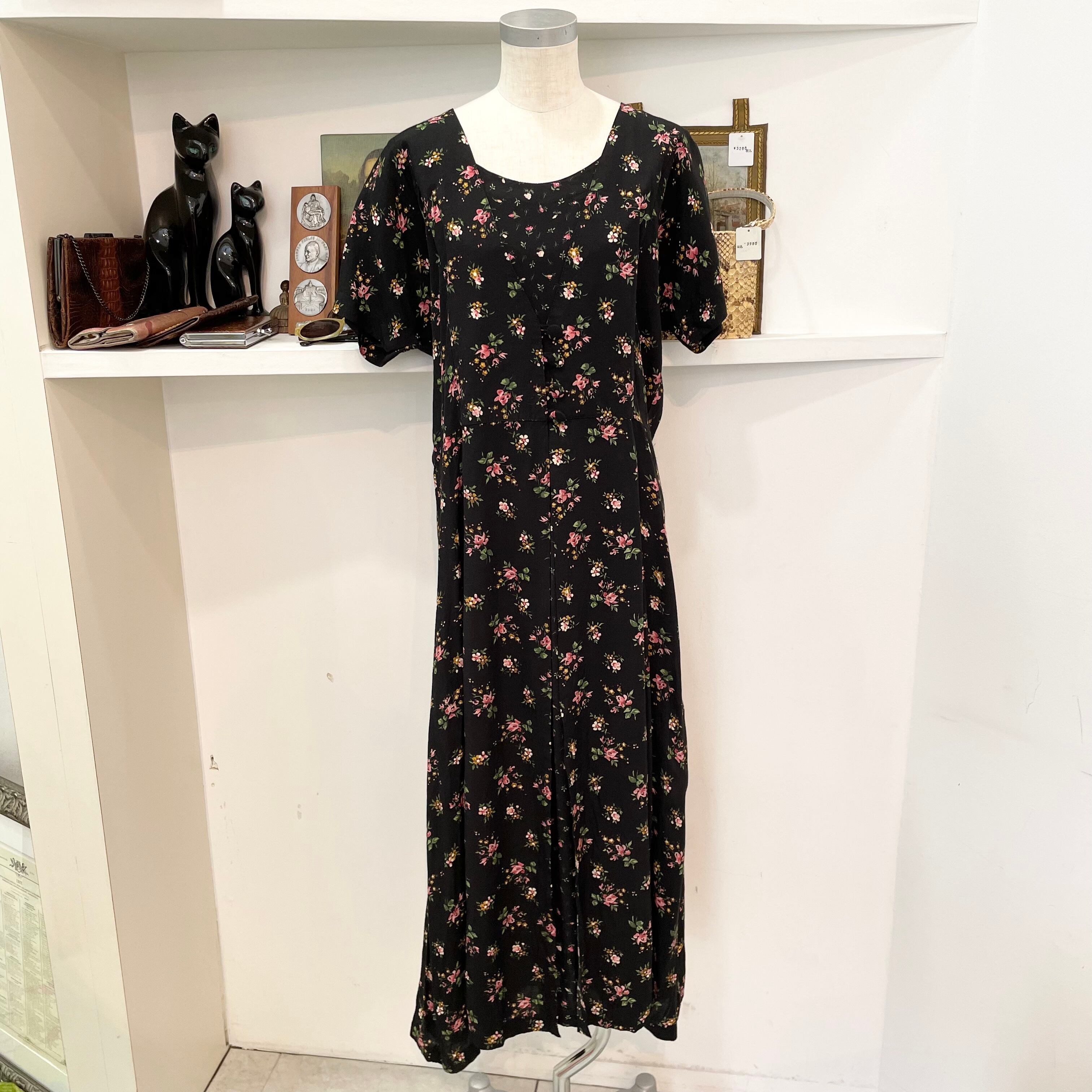 vintage/one-piece/flower/black/long/ビンテージ/ヴィンテージ/ワンピース/花柄/黒/半袖/長め