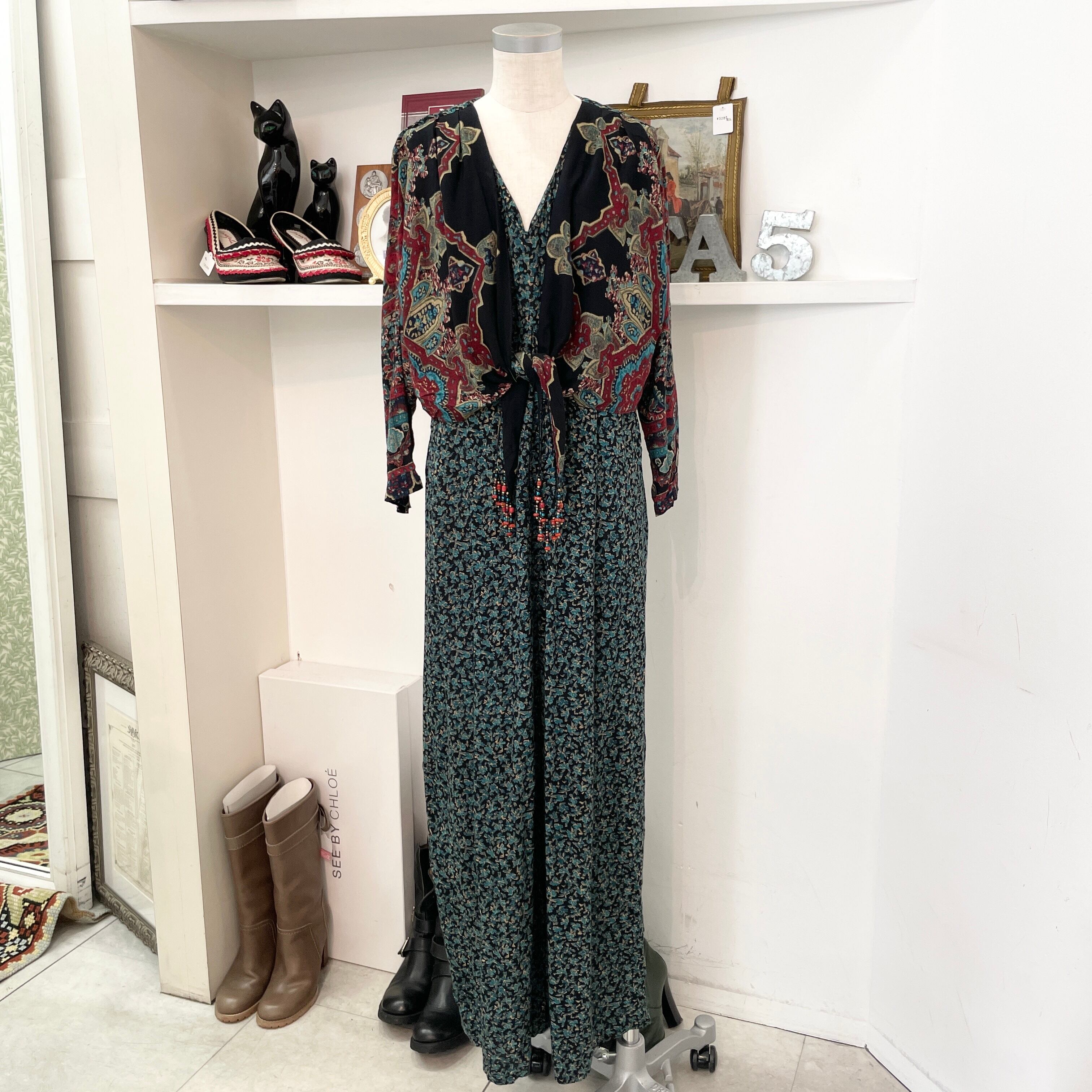 ヴィンテージのパンツ型オールインワンになります!総柄デザインにビーズの装飾品が付いているのもまた可愛い一着です⭐︎