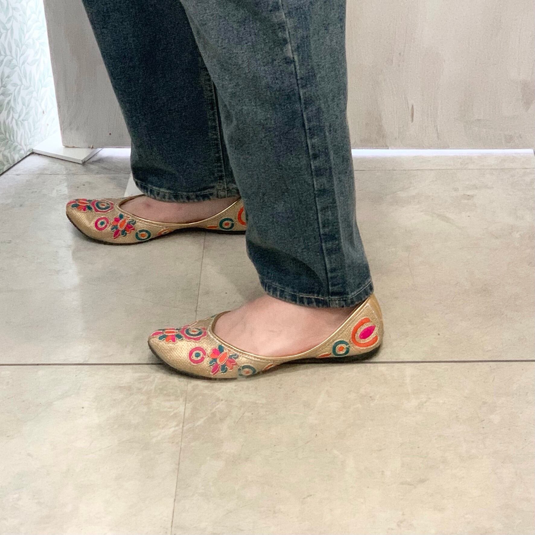 金色をベースとした色味に、様々な色を用いたデザインがとても華やかで可愛い一足となっております⭐︎